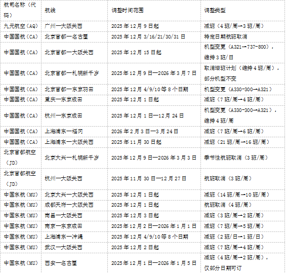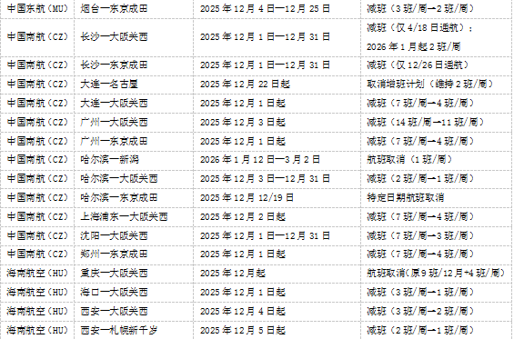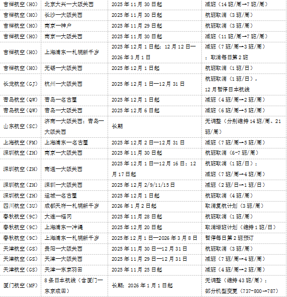 受日本首相言论事件影响的中日航线冲击波升级。从12月1日起中国航司原定的中日航班未来数月将面临较大规模的减班和取消,时间跨度覆盖元旦和春节,直至2026年3月底。