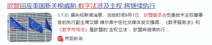9月5日,欧盟委员会启动了《数字市场法》的特别程序,要求美国科技巨头限期开放数据接口,否则将面临全球营业额10%的巨额罚款。
